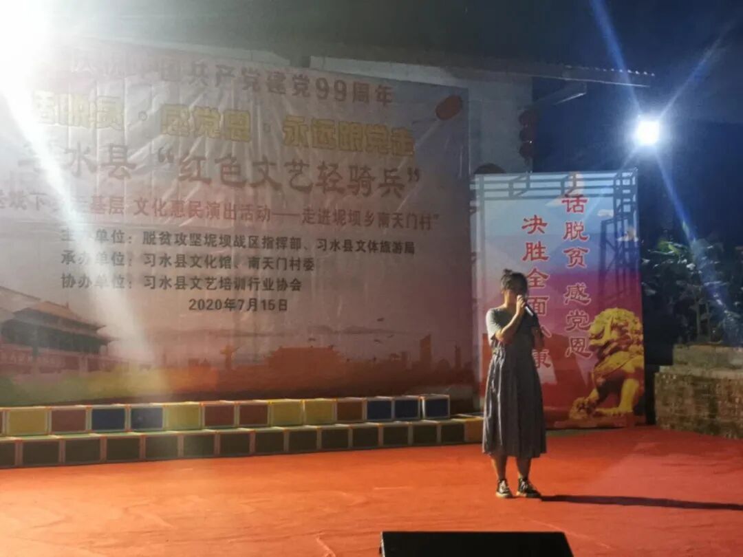 7月15日晚,坭坝乡南天门村文化舞台上乐声悠扬,载歌载舞。为庆祝中国共产党成立99周年,助推脱贫攻坚,由脱贫攻坚坭坝战区指挥部、习水县文体旅游局主办,习水县文化馆、南天门村委承办,习水县文艺培训行业协会协办的习水县“红色文艺轻骑兵”送戏下乡走基层、文化惠民演出活动——走进坭坝乡南天门村,为当地群众送上了一场精彩的文化盛宴。