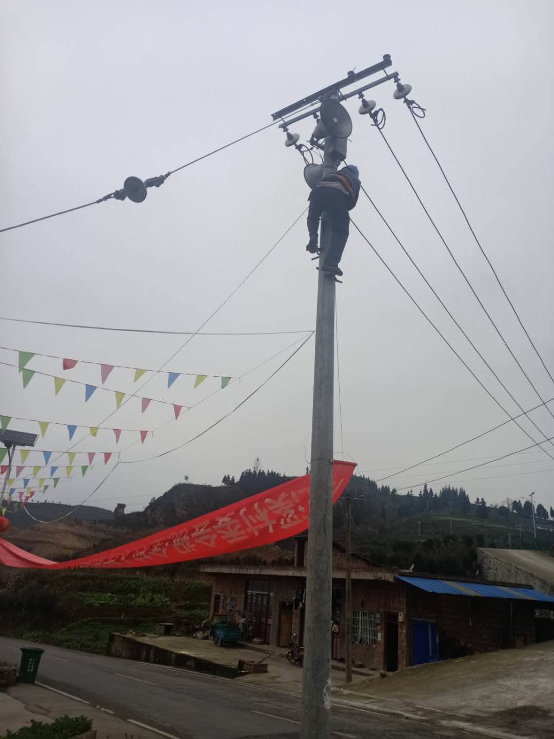 二里镇开展村村通广播设备检修工作,图片为检修人员在空中开展检修。